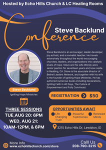 Conferences Upcoming Conferences May, 2026Ben ArmstrongBe sure to check back later for more information or watch for announcements on our Facebook page https://www.facebook.com/lchealingrooms Past Conferences Steve Backlund ConferenceAugust 1, 2, 3, 2025 Brian Orme ConferenceApril 4-6, 2025 Dawna DeSilva ConferenceOctober 4-6, 2024 Steve Backlund ConferenceAugust 20, 21, 2024August 20th videoAugust 21st morning session video